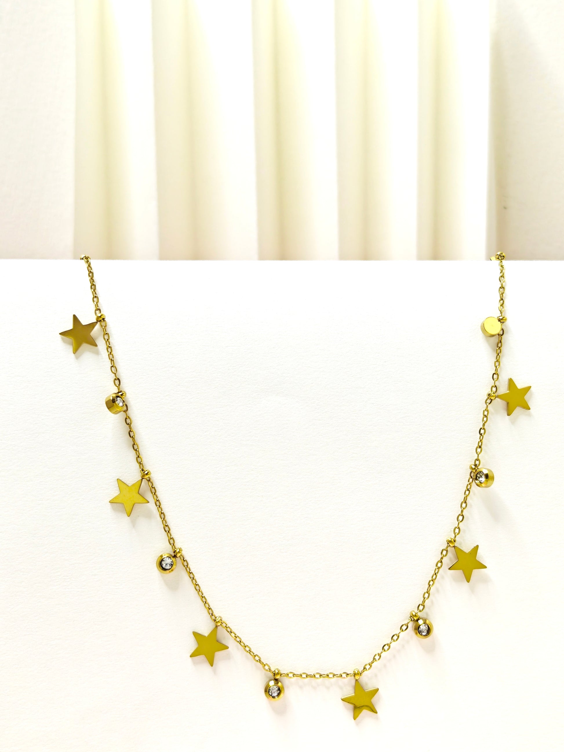 Playful yellow-gold necklace featuring a fine chain sprinkled with flat star charms and tiny round dangling beads set with clear crystals. The alternating stars and sparkling drops create a light, layered effect that sits beautifully on the neckline and is perfect for festivals, vacations and everyday glam.