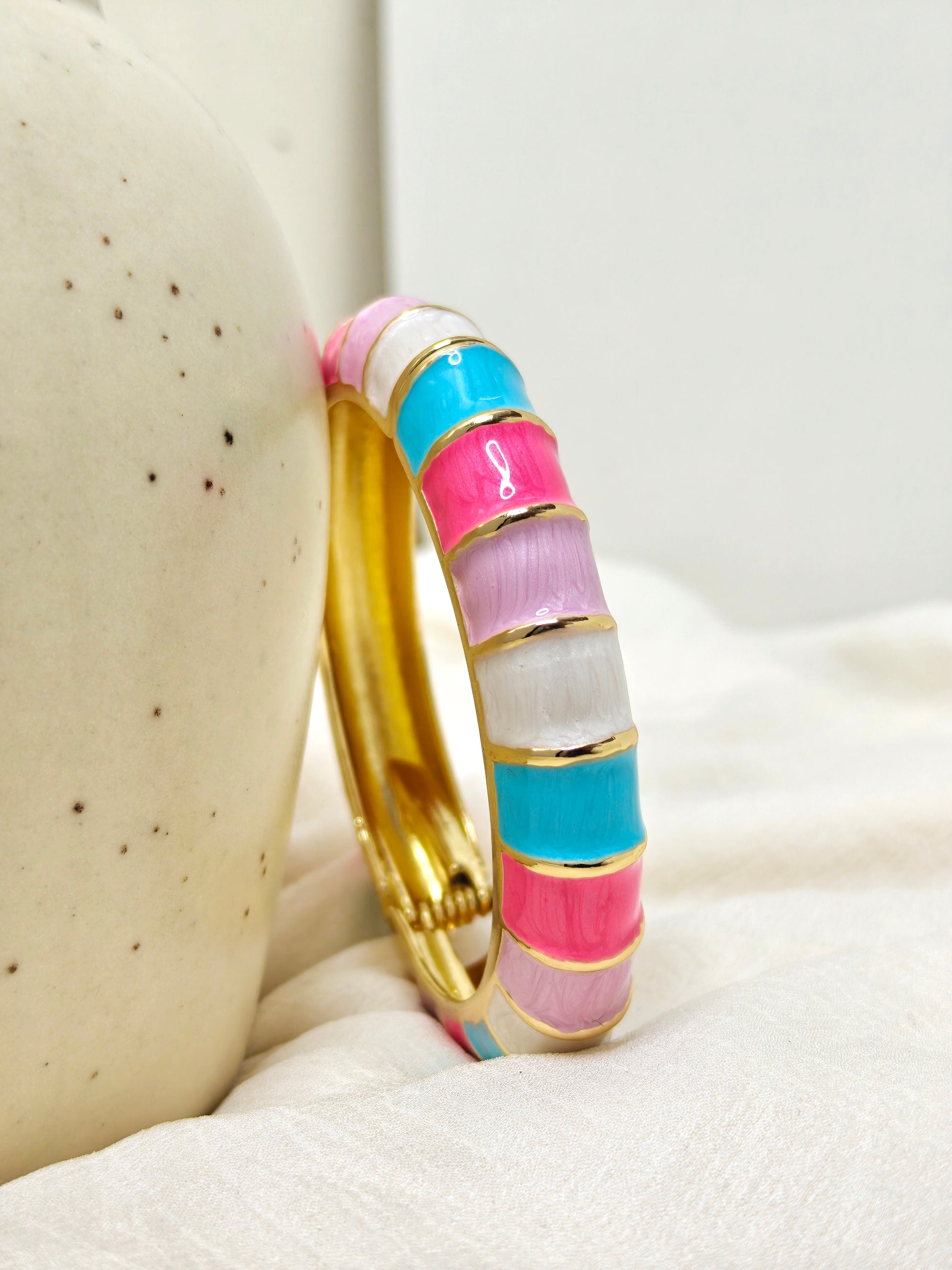 Playful half-cuff gold bangle embellished with raised rectangular enamel tiles in pastel pink, bright turquoise blue and soft ivory. The smooth inner surface and side hinge provide comfortable wear, while the colorful blocks create a fun pop of colour that instantly brightens casual outfits and vacation looks.