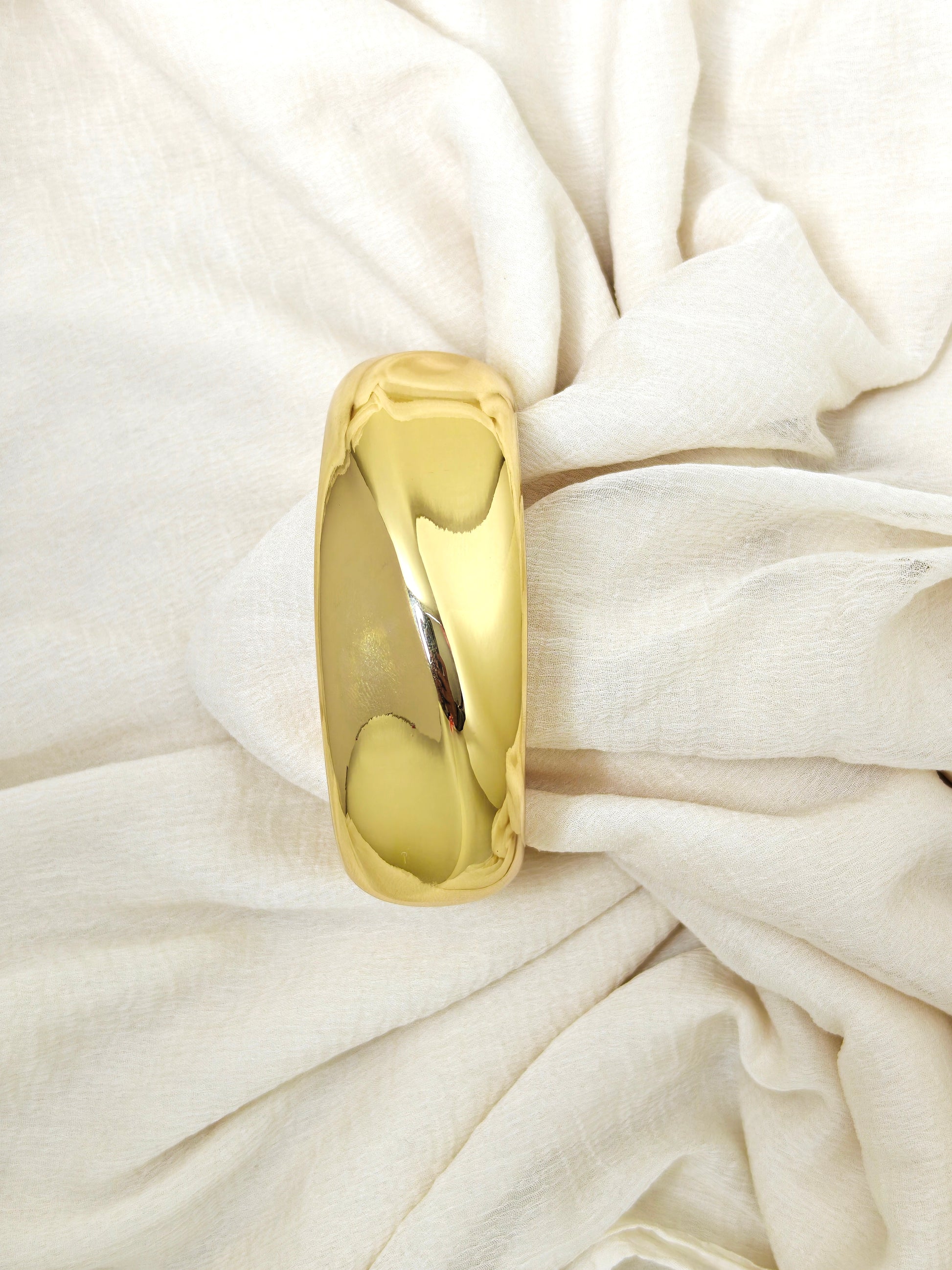 Bold statement cuff bangle fully finished in glossy yellow-gold tone with a wide dome-shaped surface. The smooth mirrored curve gently wraps around the wrist and reflects light beautifully, making it a perfect high-fashion piece to pair with solid dresses, sarees and evening gowns.